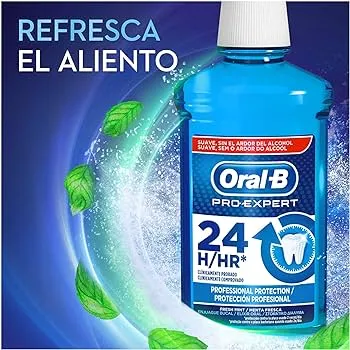 ORAL B PRO EXPERT PROTECCION PROFESIONAL ENJUAGUE BUCAL protege contra las caries, la placa, los problemas de encías, la sensibilidad, las manchas, el mal aliento, el sarro y la erosión del esmalte.